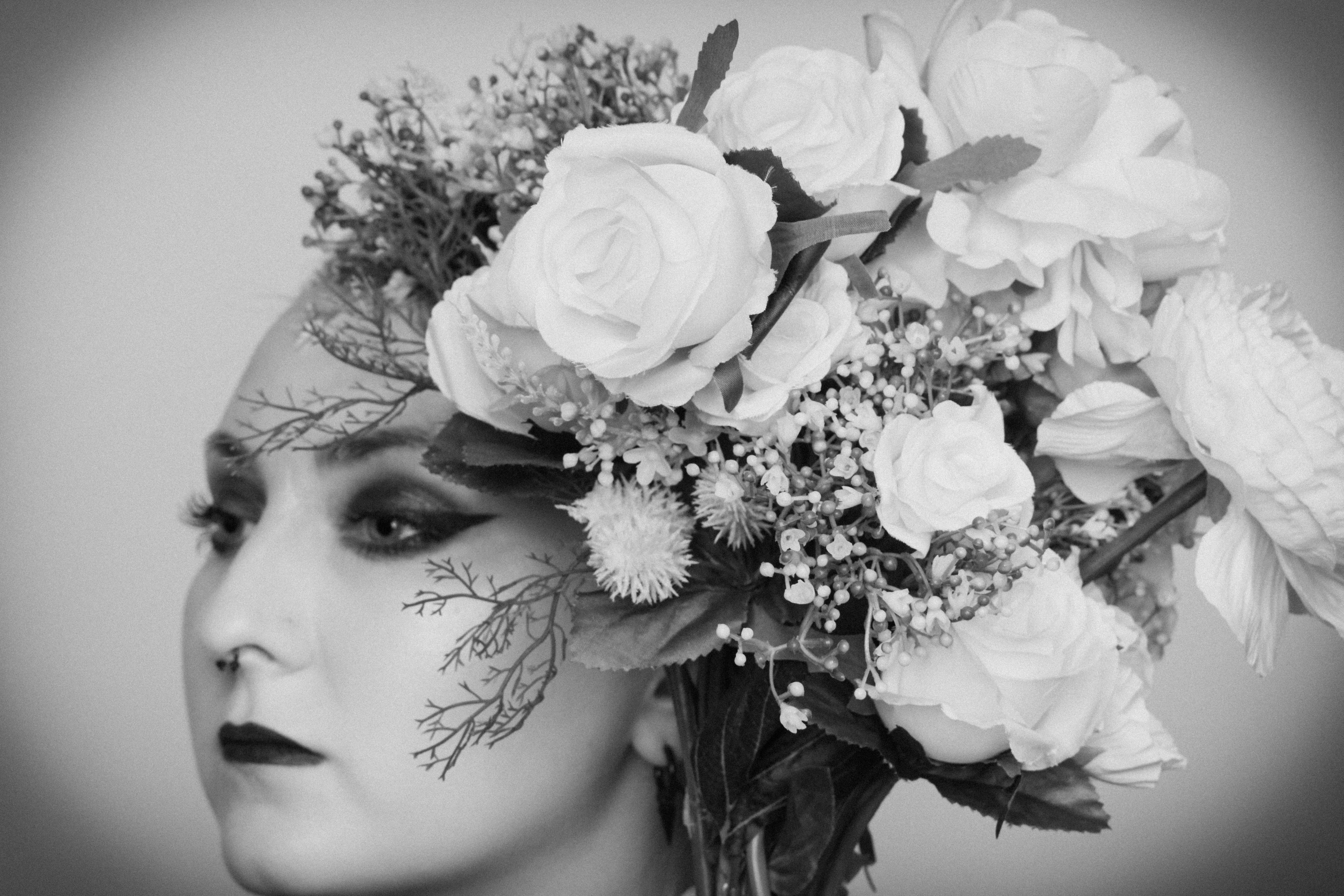 Here is my first picture for my B&W theme, I used flowers for my inspiration, The make up side of things was heavy blue eye shadow and eyeliner, black lipstick and flawless skin. Im very pleased with my final chosen picture. Not bad for my first photoshoot. The model is my beautiful friend and fellow MUA Charlie.